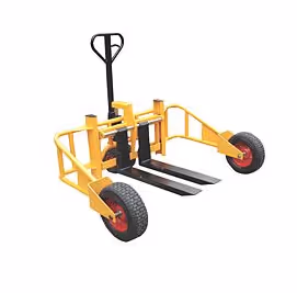 A pallet jack, also known as a pallet truck, pump truck, or jigger is a tool used to lift and move pallets. The front wheels are mounted inside the end of the forks, and as the hydraulic jack is raised, the forks are separated vertically from the front wheels, forcing the load upward until it clears the floor. The pallet is only lifted enough to clear the floor for subsequent travel. Pallet jacks are used for leveling or positioning heavy equipment, or for supporting structures. They function by means of a screw or cylinder-based actuator, powered via hydraulic, mechanical, electric or manual (hand or foot) means. Pallets are available in various sizes and materials to serve many applications. Common pallet sizes range anywhere from 20 in. x 28 in. up to 4 in. x 72 in. Plastic pallets are platforms used for storage and transportation of goods. Plastic pallets are available in various sizes, materials, and from various manufacturing processes.