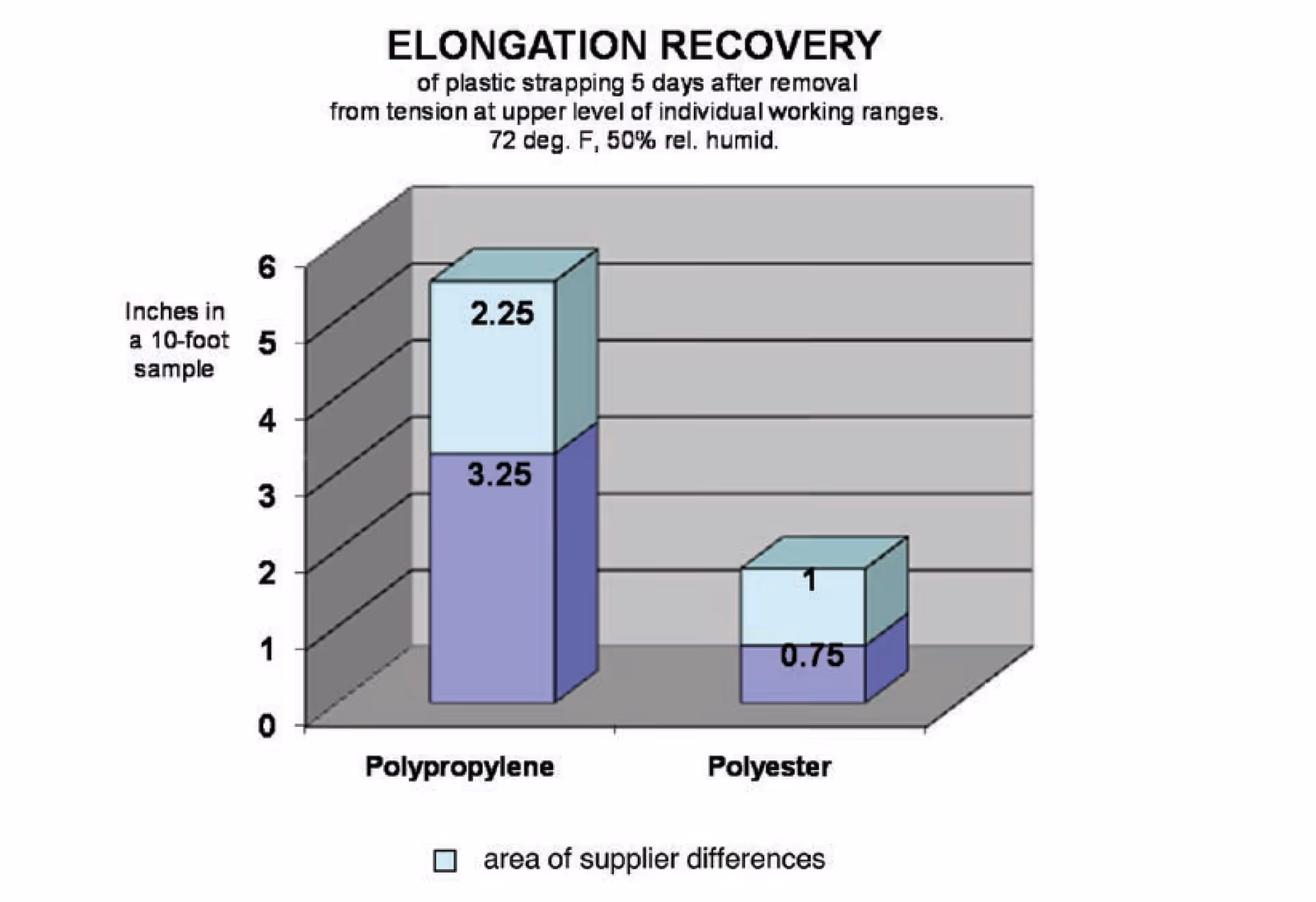Elongation Recovery is an important characteristic of strapping to consider when choosing the correct strap. Elongation- the lengthening of something. Recovery- a return to a normal state of health, mind, or strength. Vibration, handling, time, temperature and humidity cause some types of packages and unit-loads to shrink or settle quite a lot. Others shrink or settle to a lesser degree. All plastic strapping materials elongate under tension and seek to recover a part of the elongation as stress is relieved. In contrast to the plastic materials, steel strapping elongates a negligible amount, but has 100% recovery below the yield point. However, the plastic materials vary widely in their capacity to elongate and recover. Let's take a look at how elongation recovery differs between different plastic types. Let's demonstrate! We pulled plastic strapping on a rigid test rack to the upper levels of the working ranges—300 pounds for polyester, 800 pounds for high-strength polyester and 200 pounds for polypropylene. The rack testing method is designed to eliminate variables. The tests were run on strapping samples upon which sections 10 inches long had been marked off. After reaching tensions at the upper levels of their working ranges, they were measured for length and left under tension for 5 days. Finally, the samples were removed, allowed 5 days of “rest,” and again measured for length. The data in the graphs have been extrapolated so that the 10-inch samples are treated as if they were 10 feet long. The 2nd measure, it was felt, offers an appropriate compromise between the 3-foot length of strapping that might go around a small package and the 25-foot strap that might go around a large unit-load. Polyester strapping’s elongation recovery will be approximately 70%. Poly strapping's elongation recovery is 20 to 40% depending on initial retained tension. We have examined the relationships that appear between the plastic materials when each is tensioned to the upper level of its own working range. What happens when the materials are tensioned to a common level of 200 lbs.? Interestingly, the relationships remain similar. 3 questions to ask when choosing plastic strapping: How much elongation recovery appears to be required? This is important on shrinking loads. How much tension can be pulled on the strap without damaging the product? How much retained tension loss (creep) is allowed? Where a modest amount of elongation recovery will suffice, and the package can take about 300 lbs. of tension, polyester would be a more economical choice. If your business needs all the elongation recovery they can get at about 200 lbs. tension, Polypropylene ranks first, polyester second. Please note that while Elongation Recovery is important, maintaining packaging integrity is often due to high levels of Retained Tension. When the package simply cannot take much tension, polypropylene offers the most elongation recovery for the money. Humidity has no effect on the elongation recovery of polyester or polypropylene strapping. Temperature has an adverse effect on all plastic strapping, but to the greatest degree on polypropylene.